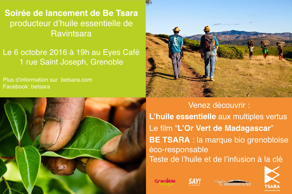 Aux Grenoblois, BE TSARA, en partenariat avec l’association Grenoble Bouge, vous invite à une soirée découverte près de chez vous à Grenoble le jeudi 6 octobre à 19h au Eyes Café, 1 rue Saint Joseph à Grenoble. BE TSARA est une marque de commerce éco-responsable malgacho-grenobloise centrée sur l’huile essentielle de Ravintsara. Le producteur, Tahina, […]